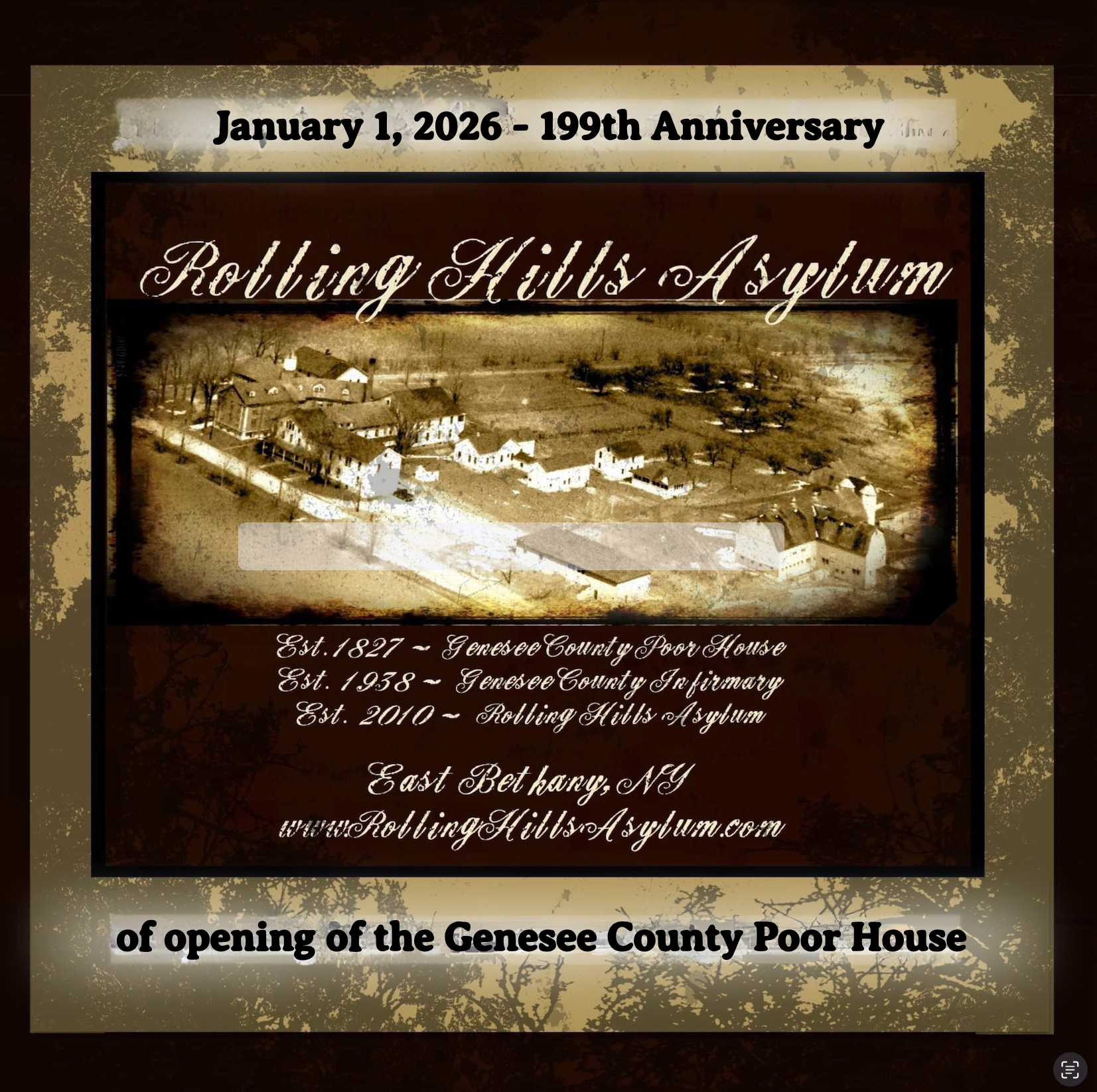 Rolling Hills Asylum in East Bethany, NY was originally opened in 1827 as The Genesee County Poor House. Located in the geographical center of the county (at the time), the property encompassed 108 acres of land, several dormitories, barns, chicken coups, ice house, dairy, wood working shop, and more. A county operated facility which cared for the locally mentally or physically disabled, indigents, widows, orphans, habitual drunkards, and more, the facility was self sufficient and was able to care for as many as 150-200 lost souls at a time, for as little as $1.08 a week. In order to keep the cost of living expenses down, all the able-body residents (“inmates”) were required to participate in the day to day operations of the facility and ground.