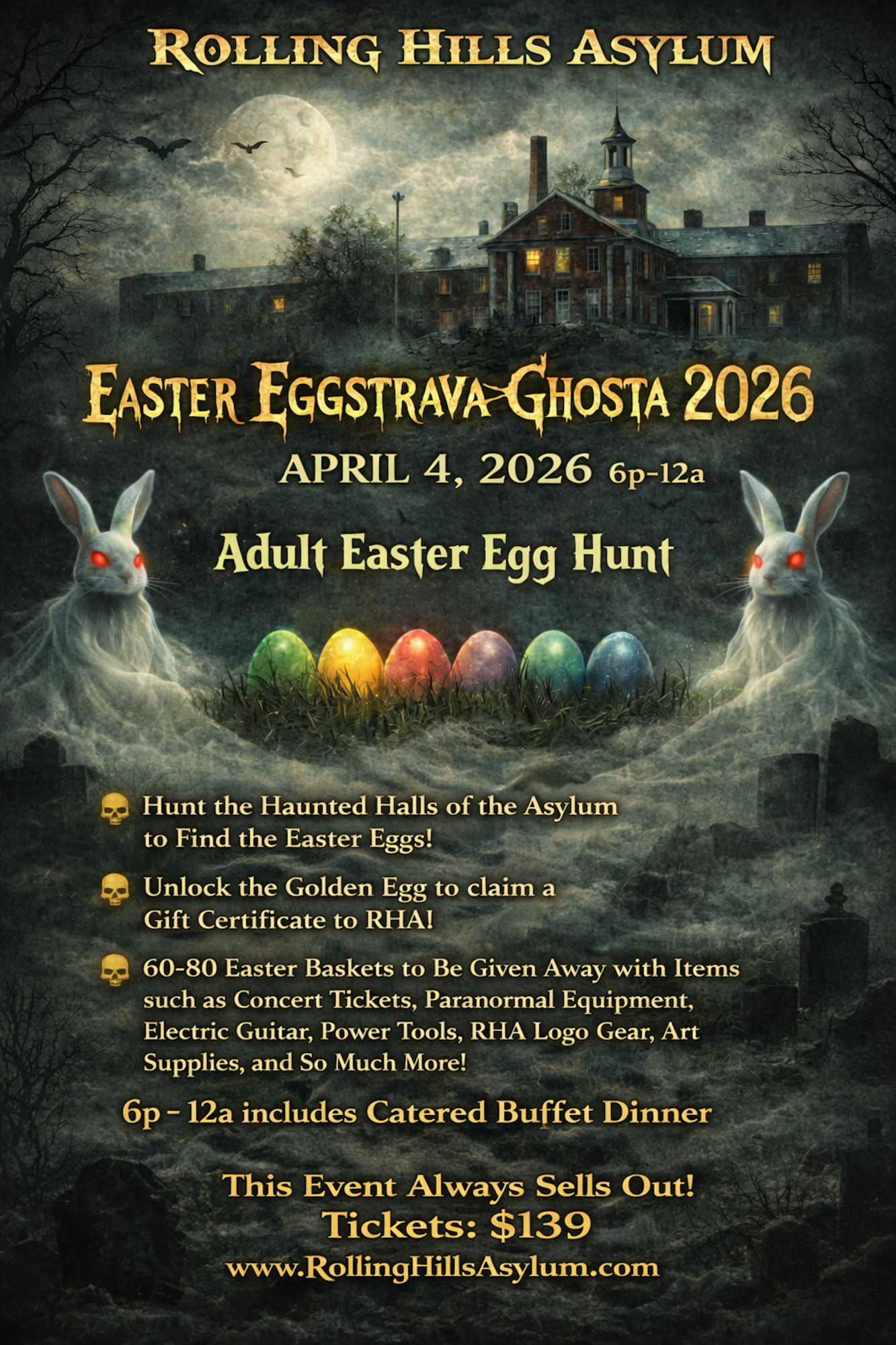 January 31, 2026 - 3 Hr Psych Hold Self Guided Ghost Hunt - 7p-10p -$49p+tax Dare to see what waits in the dark. Step into Rolling Hills Asylum, internationally famous and known as one of the most haunted asylums in the world. Spanning over 60,000 sq ft with a subterranean tunnel, its halls have witnessed tragedy for nearly two centuries. Featured on countless paranormal ghost hunting shows, its corridors are filled with shadow figures, disembodied voices, cold spots, and unexplained activity that has left even skeptics shaken. During this self-guided ghost hunt, explore the Morgue, Shadow Hallway, Psych Ward, the asylum’s tunnel, and more. Explore the haunted halls alone, or for those who want guidance, the experienced Rolling Hills crew will be available to assist in investigating and capturing paranormal evidence—spirit photos, EVP recordings, video, and personal experiences you’ll never forget. Come as a skeptic… leave a believer. Ticket Info: 18+ with valid ID. Ages 14–17 with parent (pre-authorization 2 days ahead). Parking: 30 min before scheduled time| Check-in: is promptly 15 min prior to scheduled time | No late entry. Bag rules & restrictions apply. No outside food/drinks. Closed-toe, closed-heel shoes required. The facility is NOT heated, dress appropriately. Rolling Hills Asylum has a zero tolerance policy regarding drugs and alcohol and has the right to refuse entry if suspected of being under the influence of any substance. No refunds.
