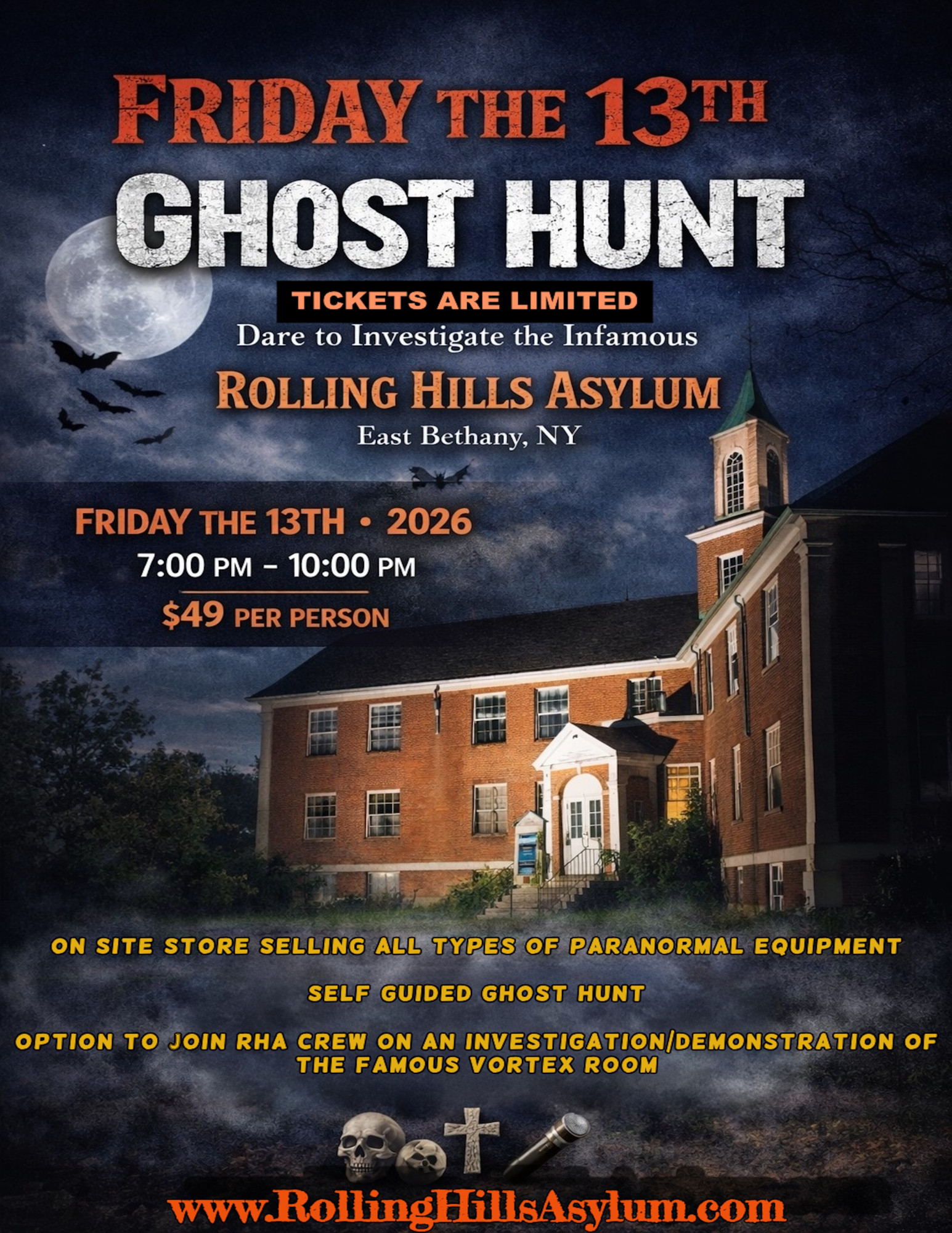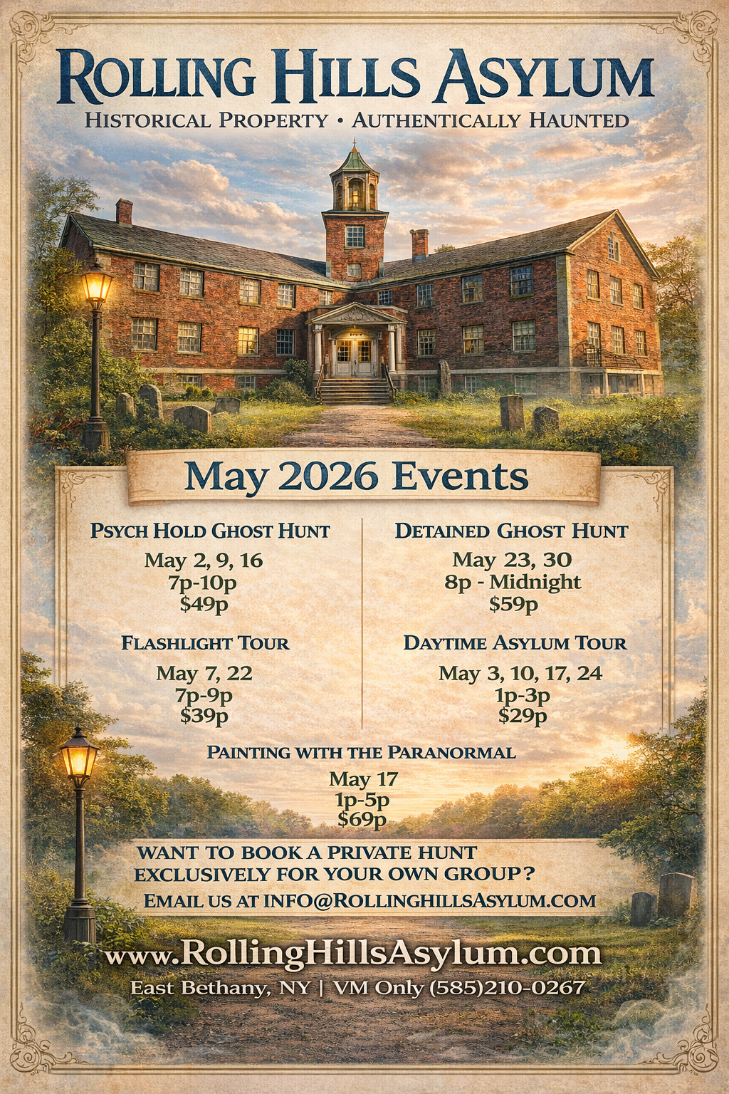 March 13, 2026 - 3 Hr Psych Hold Self Guided Ghost Hunt - 7p-10p -$49p+tax Dare to see what waits in the dark. Step into Rolling Hills Asylum, internationally famous and known as one of the most haunted asylums in the world. Spanning over 60,000 sq ft with a subterranean tunnel, its halls have witnessed tragedy for nearly two centuries. Featured on countless paranormal ghost hunting shows, its corridors are filled with shadow figures, disembodied voices, cold spots, and unexplained activity that has left even skeptics shaken. During this self-guided ghost hunt, explore the Morgue, Shadow Hallway, Psych Ward, the asylum’s tunnel, and more. Explore the haunted halls alone, or for those who want guidance, the experienced Rolling Hills crew will be available to assist in investigating and capturing paranormal evidence—spirit photos, EVP recordings, video, and personal experiences you’ll never forget. Come as a skeptic… leave a believer. Ticket Info: 18+ with valid ID. Ages 14–17 with parent (pre-authorization 2 days ahead). Parking: 30 min before scheduled time| Check-in: is promptly 15 min prior to scheduled time | No late entry. Bag rules & restrictions apply. No outside food/drinks. Closed-toe, closed-heel shoes required. The facility is NOT heated, dress appropriately. Rolling Hills Asylum has a zero tolerance policy regarding drugs and alcohol and has the right to refuse entry if suspected of being under the influence of any substance. No refunds.