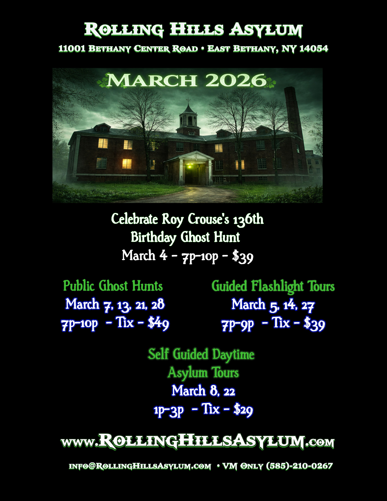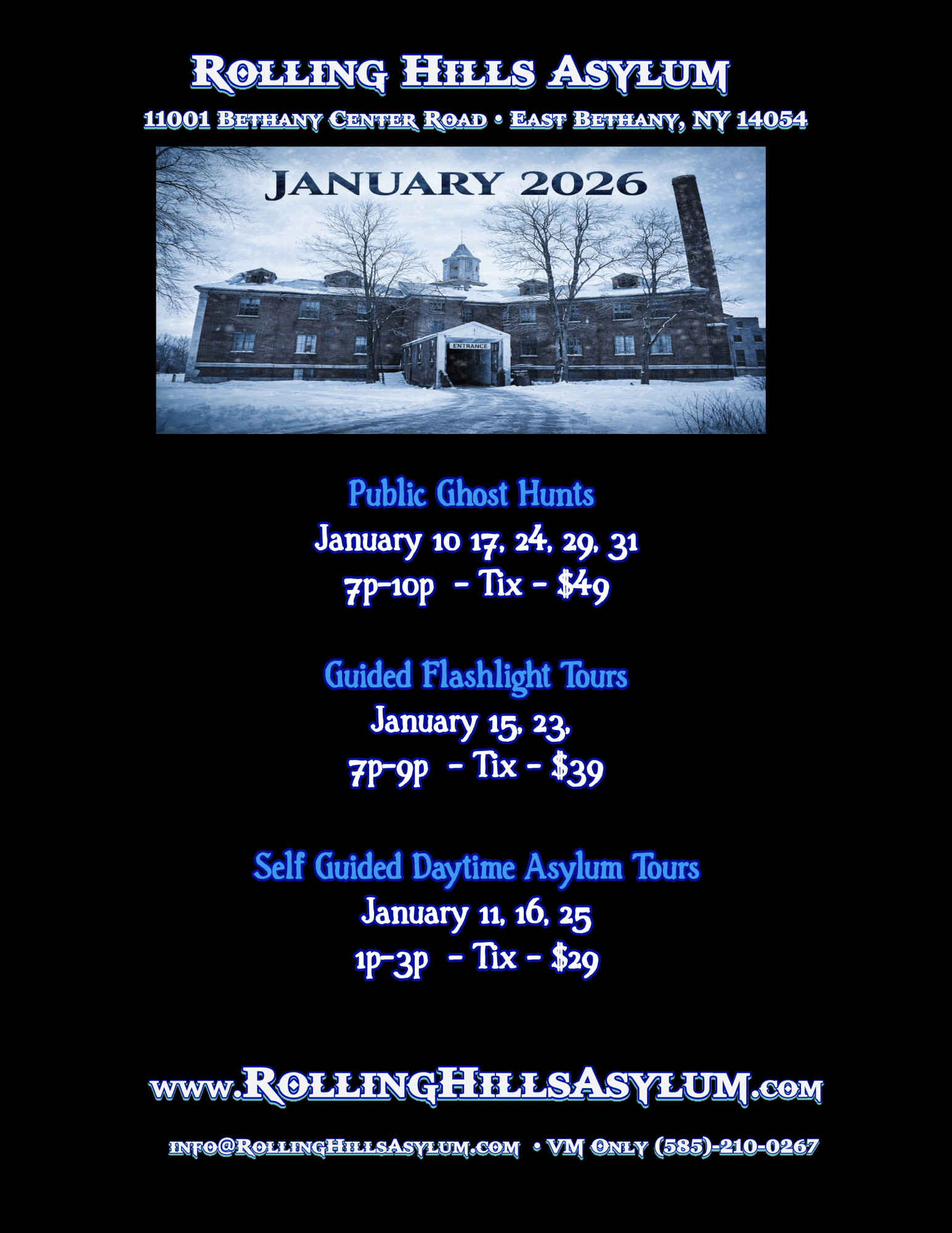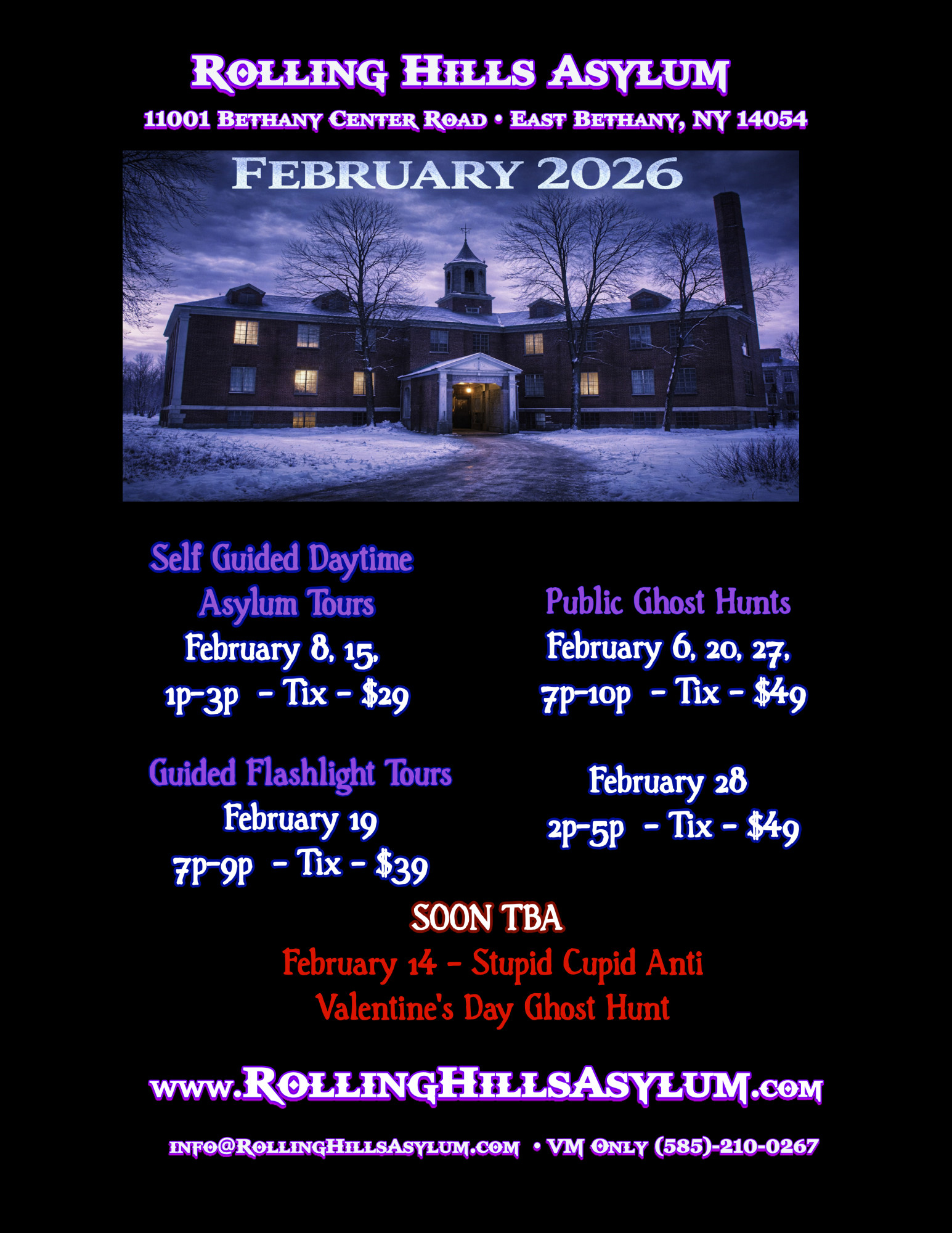 January 11, 2026 - Self Guided Daytime Asylum - 1p-3p -$29p+tax Step inside Rolling Hills Asylum, where nearly two centuries of history and hauntings converge. Once a poorhouse, infirmary, orphanage, and nursing home, it has witnessed more than 1,700 deaths—and countless reports of shadow figures, phantom voices, and unseen footsteps. By daylight, wander the asylum’s most storied spaces at your own pace, where history speaks and, at times, whispers, and the past still stirs just beyond the veil. Discover the stories of those who lived and worked here through historical plaques and photos displayed throughout, with a touch of the paranormal that has made Rolling Hills famous. Step into history… and feel the past come alive. Ticket Info: 18+ with valid ID. Ages 14–17 with parent (pre-authorization 2 days ahead). Parking: 30 min before scheduled time| Check-in: is promptly 15 min prior to scheduled time | No late entry. Bag rules & restrictions apply. No outside food/drinks. Closed-toe, closed-heel shoes required. The facility is NOT heated, dress appropriately. Rolling Hills Asylum has a zero tolerance policy regarding drugs and alcohol and has the right to refuse entry if suspected of being under the influence of any substance. No refunds.