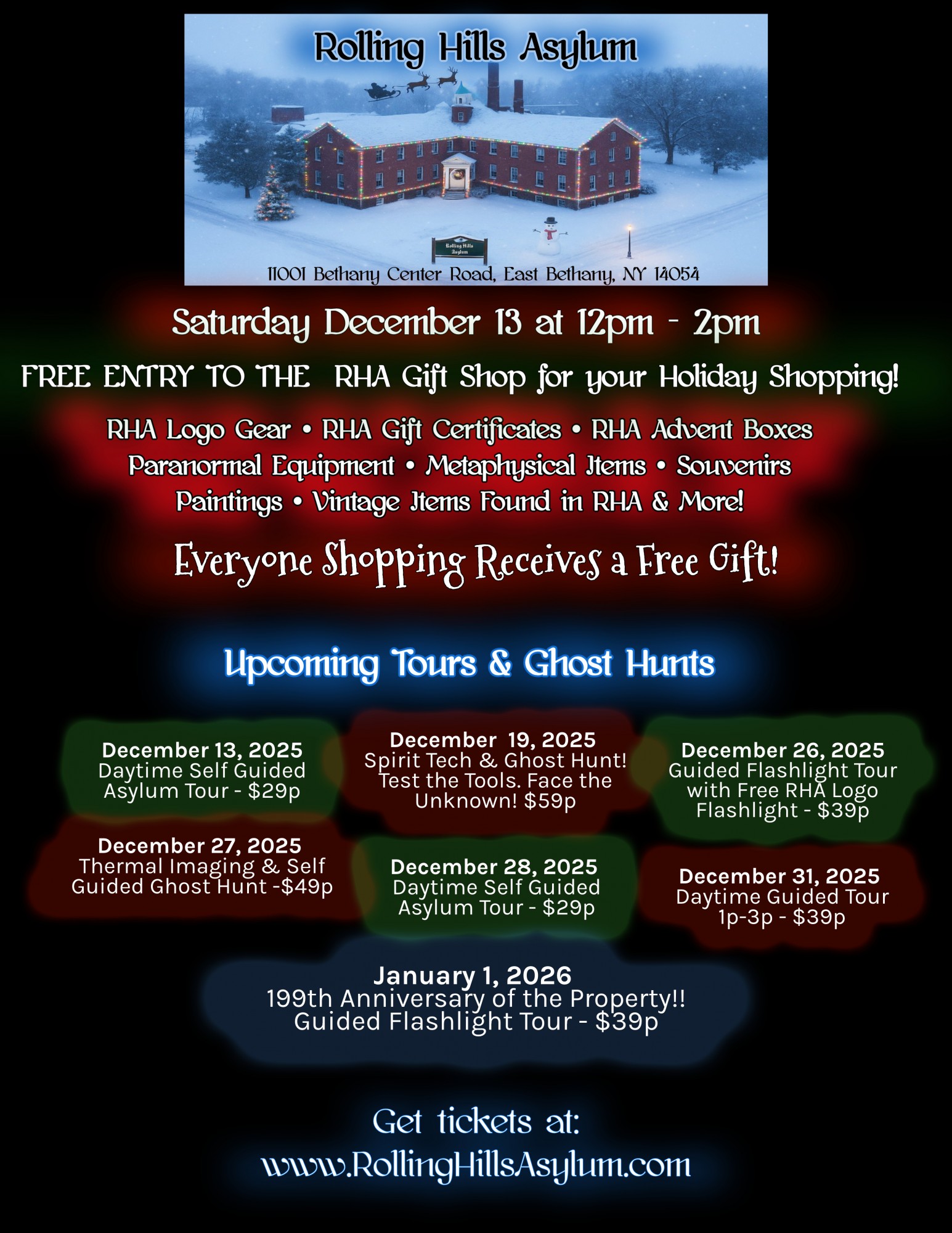 December 28, 2025 - Daytime Self Guided Asylum Tour. 1p-3p - $29p - Step inside Rolling Hills Asylum, where nearly two centuries of history and hauntings converge. Once a poorhouse, infirmary, orphanage, and nursing home, it has witnessed more than 1,700 deaths—and countless reports of shadow figures, phantom voices, and unseen footsteps. By daylight, wander the asylum’s most storied spaces at your own pace, where history speaks and, at times, whispers, and the past still stirs just beyond the veil. Discover the stories of those who lived and worked here through historical plaques and photos displayed throughout, with a touch of the paranormal that has made Rolling Hills famous. Step into history… and feel the past come alive. Ticket Info: 18+ with valid ID. Ages 14–17 with parent (pre-authorization 2 days ahead). Parking: 30 min before | Check-in: 15 min | No late entry. Bag rules & restrictions apply. No outside food/drinks. Closed-toe, closed-heel shoes required. The facility is NOT heated, dress appropriately. Rolling Hills Asylum has a zero tolerance policy regarding drugs and alcohol and has the right to refuse entry if suspected of being under the influence of any substance. No refunds.