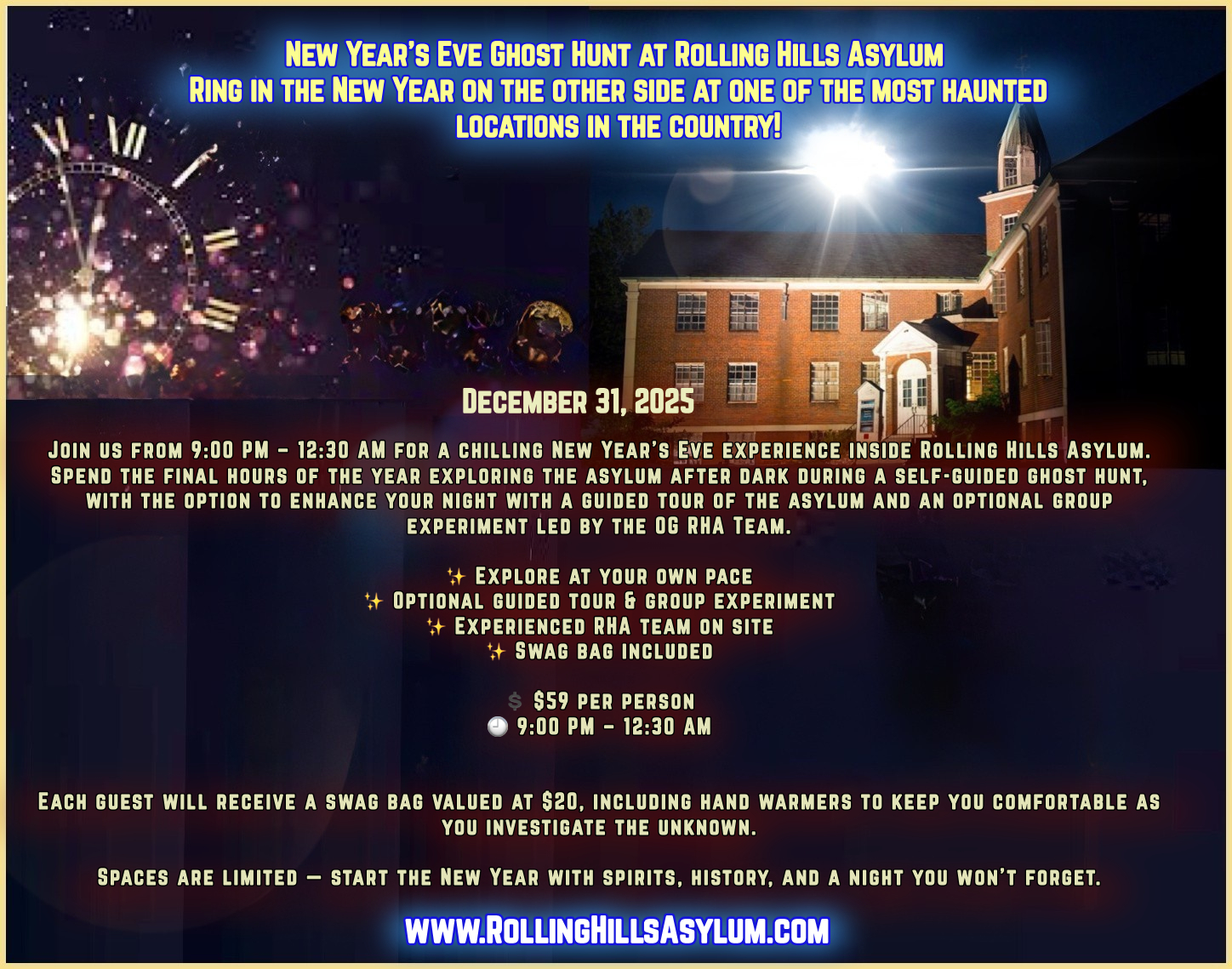 December 27, 2025 - Thermal Imaging & Self Guided Ghost Hunt 6p-9p - $59p - Step into Rolling Hills Asylum, internationally famous and known as one of the most haunted asylums in the world. Spanning over 60,000 sq ft with a subterranean tunnel, its halls have witnessed tragedy for nearly two centuries. Featured on countless paranormal ghost hunting shows, its corridors are filled with shadow figures, disembodied voices, cold spots, and unexplained activity that has left even skeptics shaken. Tonight, learn how to a thermal imaging camera is able to expose cold anomalies and unexplained shapes as apposed to naturally occurring cold spots. Following the demonstration is a self-guided ghost hunt where you can explore the Morgue, Shadow Hallway, Psych Ward, and more as you attempt to capture paranormal evidence—spirit photos, EVP recordings, video, and personal experiences you’ll never forget. Come as a skeptic… leave a believer. Ticket Info: 18+ with valid ID. Ages 14–17 with parent (pre-authorization 2 days ahead). Parking: 30 min before | Check-in: 15 min | No late entry. Bag rules & restrictions apply. No outside food/drinks. Closed-toe, closed-heel shoes required. The facility is NOT heated, dress appropriately. Rolling Hills Asylum has a zero tolerance policy regarding drugs and alcohol and has the right to refuse entry if suspected of being under the influence of any substance. No refunds.