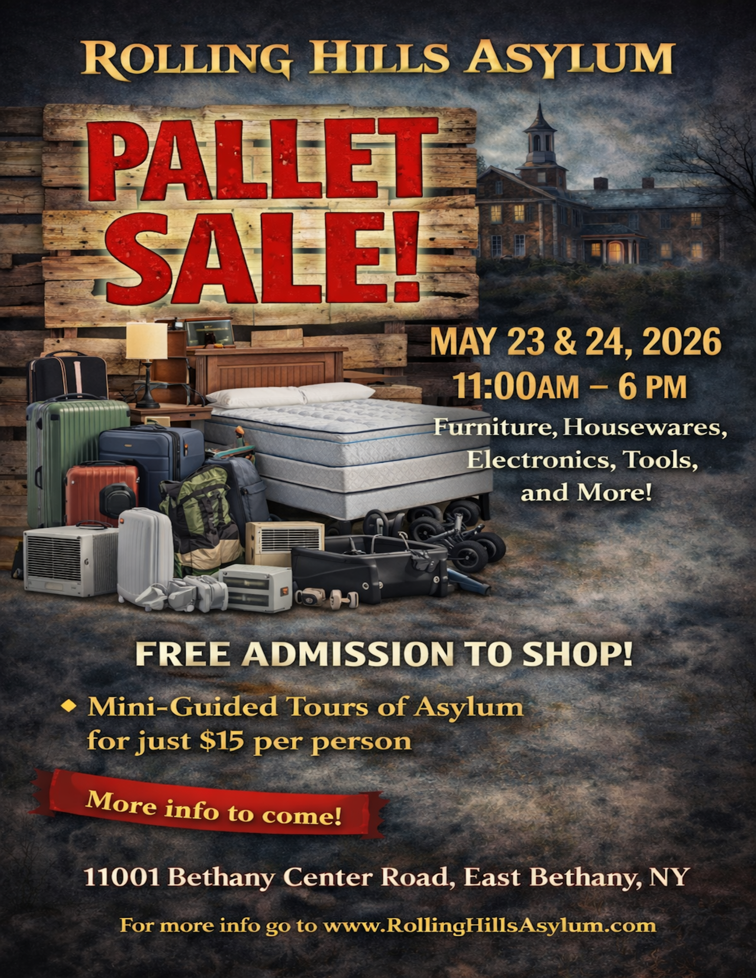 March 14 2026 - Guided Flashlight Tour 7p-9p $39+tax. Step into the shadows with your FREE LOGO flashlight (as supplies last) and uncover the asylum’s chilling history. Your experienced guide will take you on an exploration of infamous areas like the Morgue, Shadow Hallway, and Psych Ward—where whispers, shadowy figures, and footsteps echo in the dark. You will learn not only about the history of the Asylum, but also of some of our most preeminent spirits. By flashlight, the past comes alive—some tragic, some terrifying—as you walk the hallways where history was written in life and death. By night, Rolling Hills transforms into a place where the line between the living and the dead is razor thin. Step into the shadows where history and hauntings meet. Ticket Info: 18+ with valid ID. Ages 14–17 with parent (pre-authorization 2 days ahead). Parking: 30 min before scheduled time| Check-in: is promptly 15 min prior to scheduled time | No late entry. Bag rules & restrictions apply. No outside food/drinks. Closed-toe, closed-heel shoes required. The facility is NOT heated, dress appropriately. Rolling Hills Asylum has a zero tolerance policy regarding drugs and alcohol and has the right to refuse entry if suspected of being under the influence of any substance. No refunds.