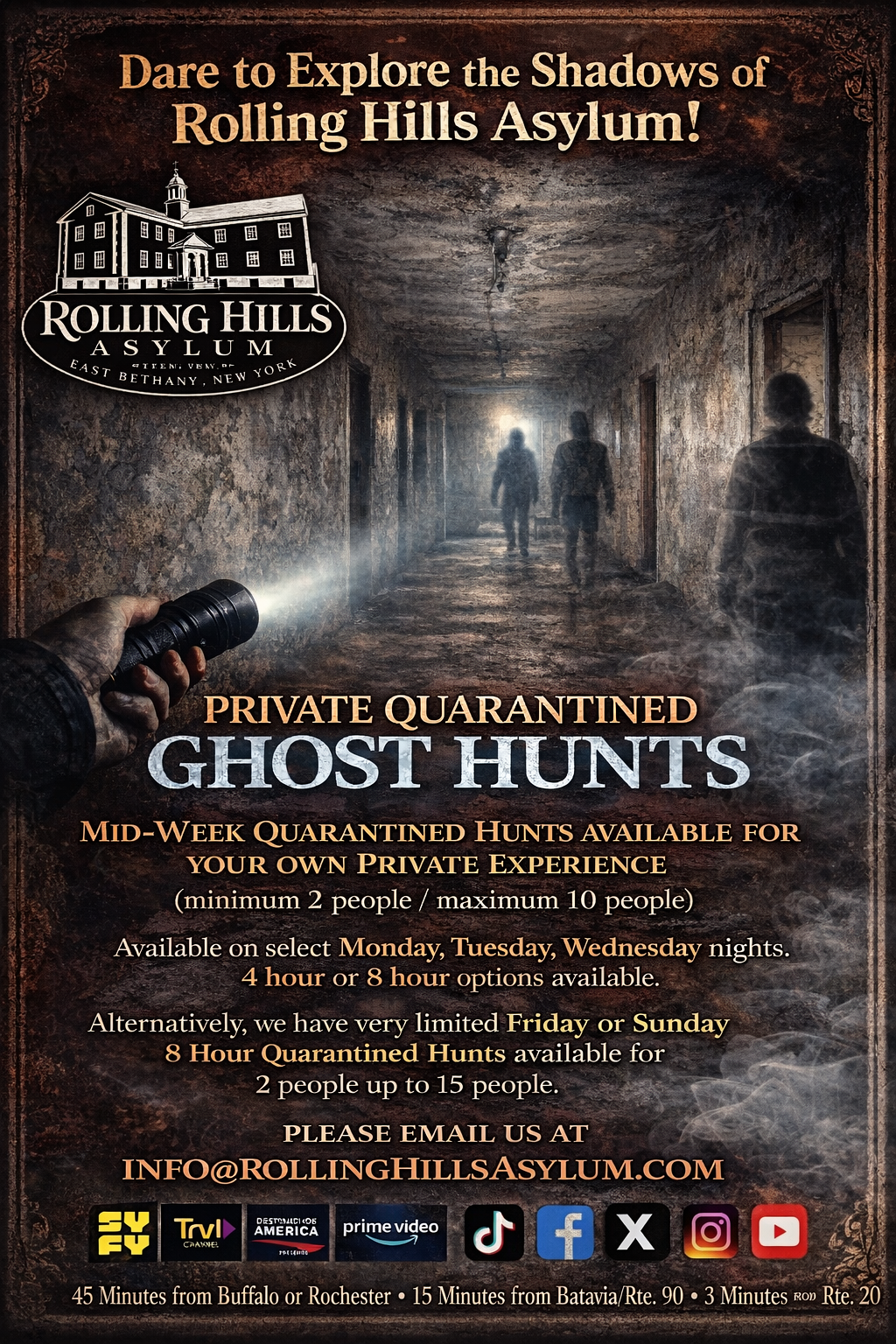 March 11, 2026 Winter Private Quarantined Ghost Hunt 7:00 PM – 10:00 PM - $399 +tax • 2 person minimum / 10 person maximum per private group When the snow settles and the temperature drops, Rolling Hills Asylum grows unnervingly still. In the deep winter quiet, every sound carries… and the shadows feel closer than ever. Book your own Private Quarantined Ghost Hunt and enjoy exclusive access for just your group. With no other guests in the building, you’ll explore the most active locations — the infirmary, shadowed corridors, and well-known hotspots where countless visitors have reported voices, footsteps, and full-bodied apparitions. Bring your own equipment, however, no special equipment is required — your cell phone is truly all you need. However, if you’d like to enhance your experience, RHA’s onsite store offers a full range of professional paranormal investigation equipment for purchase — the very same tools used by veteran investigators. Ownership means you take your evidence home, continue investigating anywhere, and build your own kit instead of paying rental fees for gear you must give back. Your group will be oriented on safety and allowed to investigate at your own pace, in your own way. Bring your curiosity, your questions, and your courage — winter investigations at Rolling Hills are raw, quiet, and intensely personal. The air is still, the building is hushed, and activity is known to spike when the living are few… and the night is long. Perfect for couples, small groups, seasoned investigators, and brave first-timers who want privacy, darkness, and an undistracted encounter with the asylum’s spirits. Are you ready to quarantine with the spirits? Ticket Info: 18+ with valid ID. Ages 14–17 with parent (pre-authorization 2 days ahead). Parking: 30 min before scheduled time| Check-in: is promptly 15 min prior to scheduled time | No late entry. Bag rules & restrictions apply. No outside food/drinks. Closed-toe, closed-heel shoes required. The facility is NOT heated, dress appropriately. Rolling Hills Asylum has a zero tolerance policy regarding drugs and alcohol and has the right to refuse entry if suspected of being under the influence of any substance. No refunds.