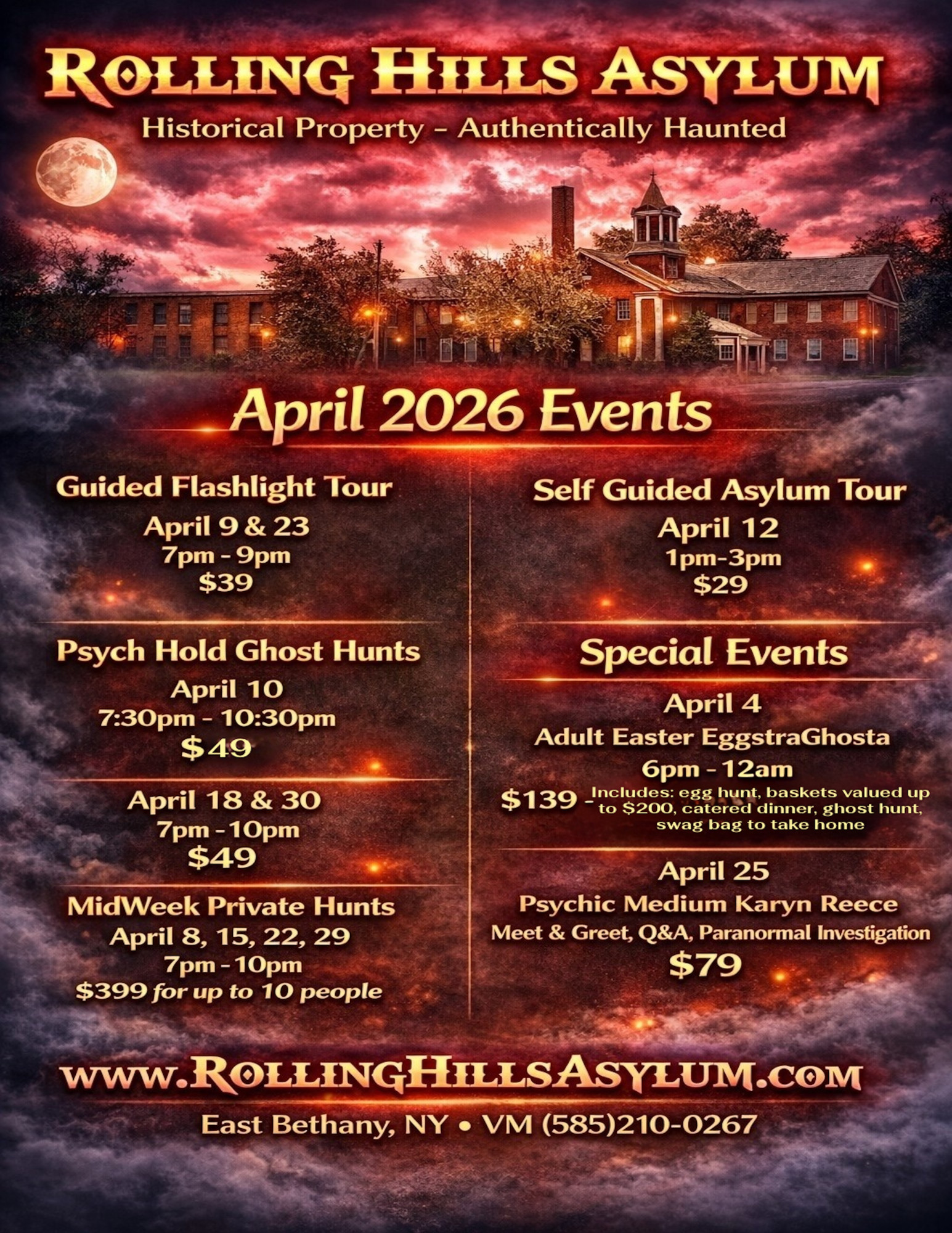 April 4, 2026 - RHA's Annual Adult Easter EggstravaGhosta Event, Dinner & Ghost Hunt - 6:00pm -12am - $139pp. Rolling Hills Asylum Annual Easter Egg Hunt (fundraiser for the Asylum) is always a huge hit! We hide hundreds & hundreds of eggs throughout the asylum - all containing various number of chits. Collect the eggs, use the chits in a basket draw. Baskets include everything from pendulums and paranormal equipment, to RHA logo items, concert tickets & more (basket values range from $25 to over $100 each). Event Includes catered buffet dinner. Following dinner and Easter fun is a self guided ghost hunt. These tickets go fast! Don't miss out! Ticket Info: 18+ with valid ID. Ages 14–17 with parent (pre-authorization 2 days ahead). Parking: 30 min before scheduled time| Check-in: is promptly 15 min prior to scheduled time | No late entry. Bag rules & restrictions apply. No outside food/drinks. Closed-toe, closed-heel shoes required. The facility is NOT heated, dress appropriately. Rolling Hills Asylum has a zero tolerance policy regarding drugs and alcohol and has the right to refuse entry if suspected of being under the influence of any substance. No refunds.