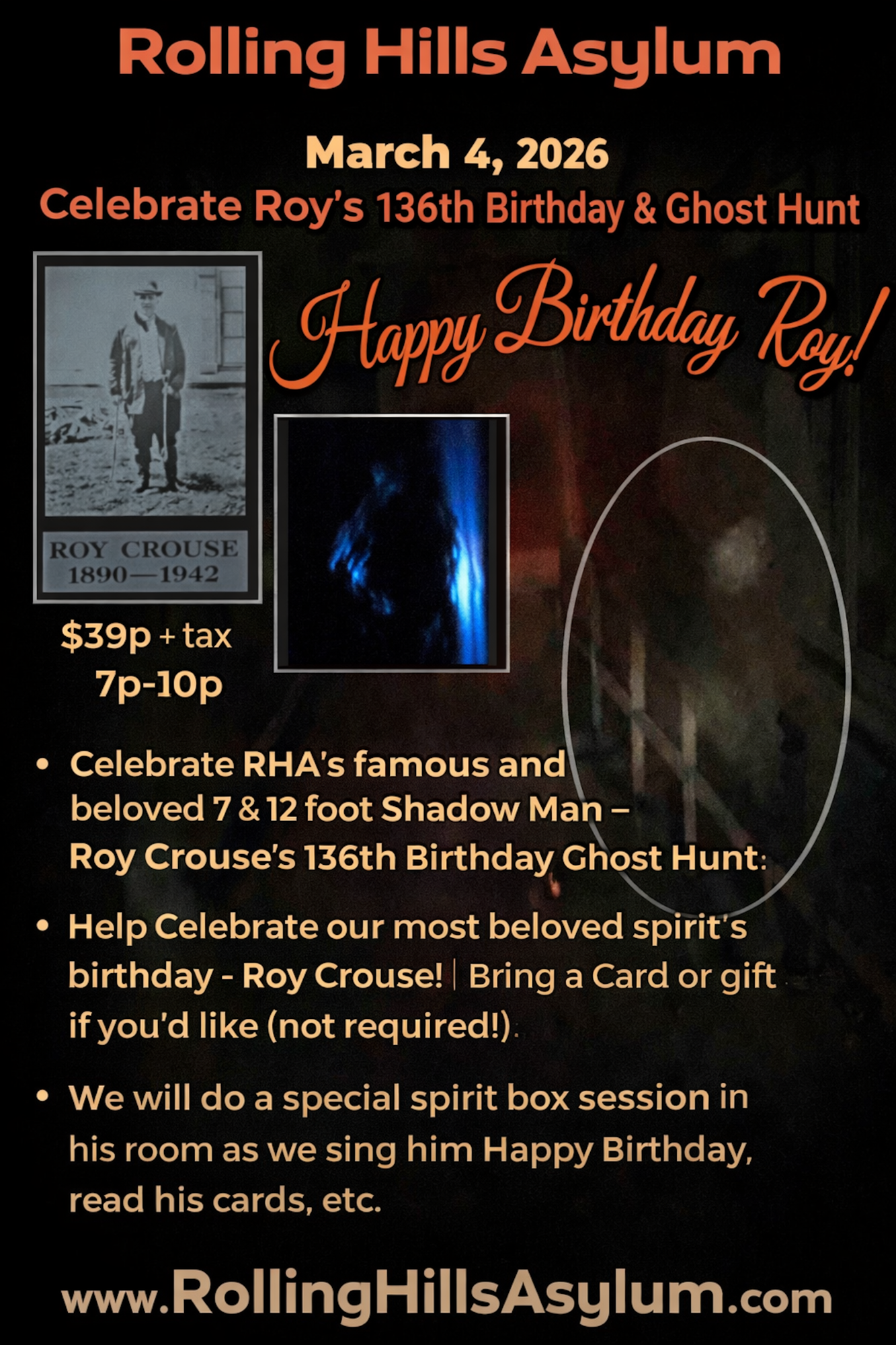 January 10, 2026 - 3 Hr Psych Hold Self Guided Ghost Hunt - 7p-10p -$49p+tax Dare to see what waits in the dark. Step into Rolling Hills Asylum, internationally famous and known as one of the most haunted asylums in the world. Spanning over 60,000 sq ft with a subterranean tunnel, its halls have witnessed tragedy for nearly two centuries. Featured on countless paranormal ghost hunting shows, its corridors are filled with shadow figures, disembodied voices, cold spots, and unexplained activity that has left even skeptics shaken. During this self-guided ghost hunt, explore the Morgue, Shadow Hallway, Psych Ward, the asylum’s tunnel, and more. Explore the haunted halls alone, or for those who want guidance, the experienced Rolling Hills crew will be available to assist in investigating and capturing paranormal evidence—spirit photos, EVP recordings, video, and personal experiences you’ll never forget. Come as a skeptic… leave a believer. Ticket Info: 18+ with valid ID. Ages 14–17 with parent (pre-authorization 2 days ahead). Parking: 30 min before scheduled time| Check-in: is promptly 15 min prior to scheduled time | No late entry. Bag rules & restrictions apply. No outside food/drinks. Closed-toe, closed-heel shoes required. The facility is NOT heated, dress appropriately. Rolling Hills Asylum has a zero tolerance policy regarding drugs and alcohol and has the right to refuse entry if suspected of being under the influence of any substance. No refunds.