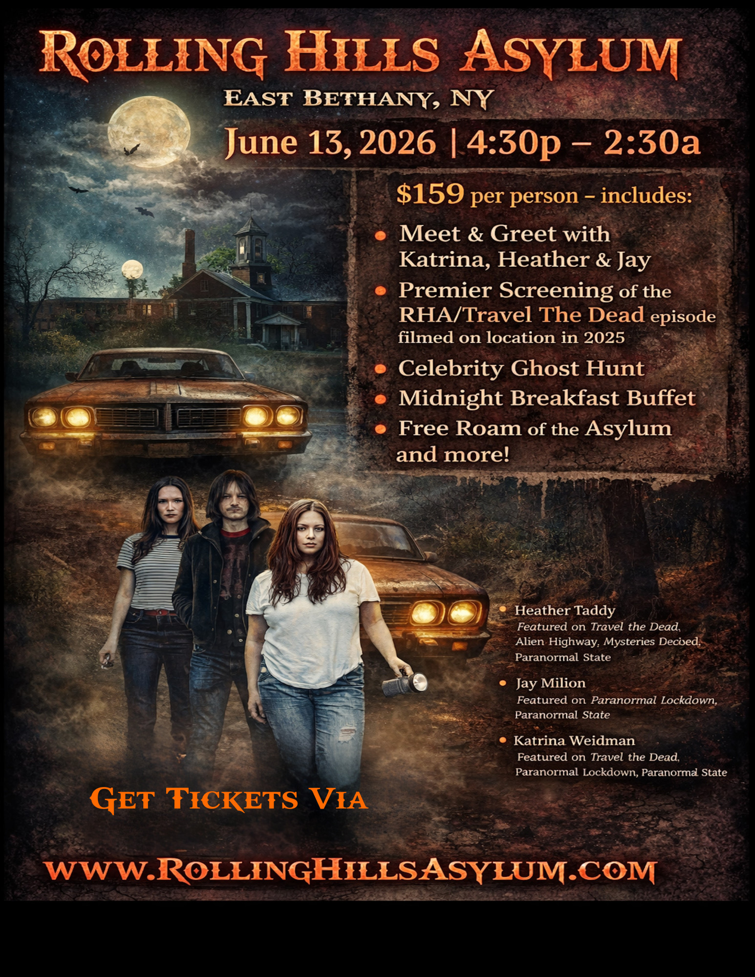 January 24, 2026 - 3 Hr Psych Hold Self Guided Ghost Hunt - 7p-10p -$49p+tax Dare to see what waits in the dark. Step into Rolling Hills Asylum, internationally famous and known as one of the most haunted asylums in the world. Spanning over 60,000 sq ft with a subterranean tunnel, its halls have witnessed tragedy for nearly two centuries. Featured on countless paranormal ghost hunting shows, its corridors are filled with shadow figures, disembodied voices, cold spots, and unexplained activity that has left even skeptics shaken. During this self-guided ghost hunt, explore the Morgue, Shadow Hallway, Psych Ward, the asylum’s tunnel, and more. Explore the haunted halls alone, or for those who want guidance, the experienced Rolling Hills crew will be available to assist in investigating and capturing paranormal evidence—spirit photos, EVP recordings, video, and personal experiences you’ll never forget. Come as a skeptic… leave a believer. Ticket Info: 18+ with valid ID. Ages 14–17 with parent (pre-authorization 2 days ahead). Parking: 30 min before scheduled time| Check-in: is promptly 15 min prior to scheduled time | No late entry. Bag rules & restrictions apply. No outside food/drinks. Closed-toe, closed-heel shoes required. The facility is NOT heated, dress appropriately. Rolling Hills Asylum has a zero tolerance policy regarding drugs and alcohol and has the right to refuse entry if suspected of being under the influence of any substance. No refunds.