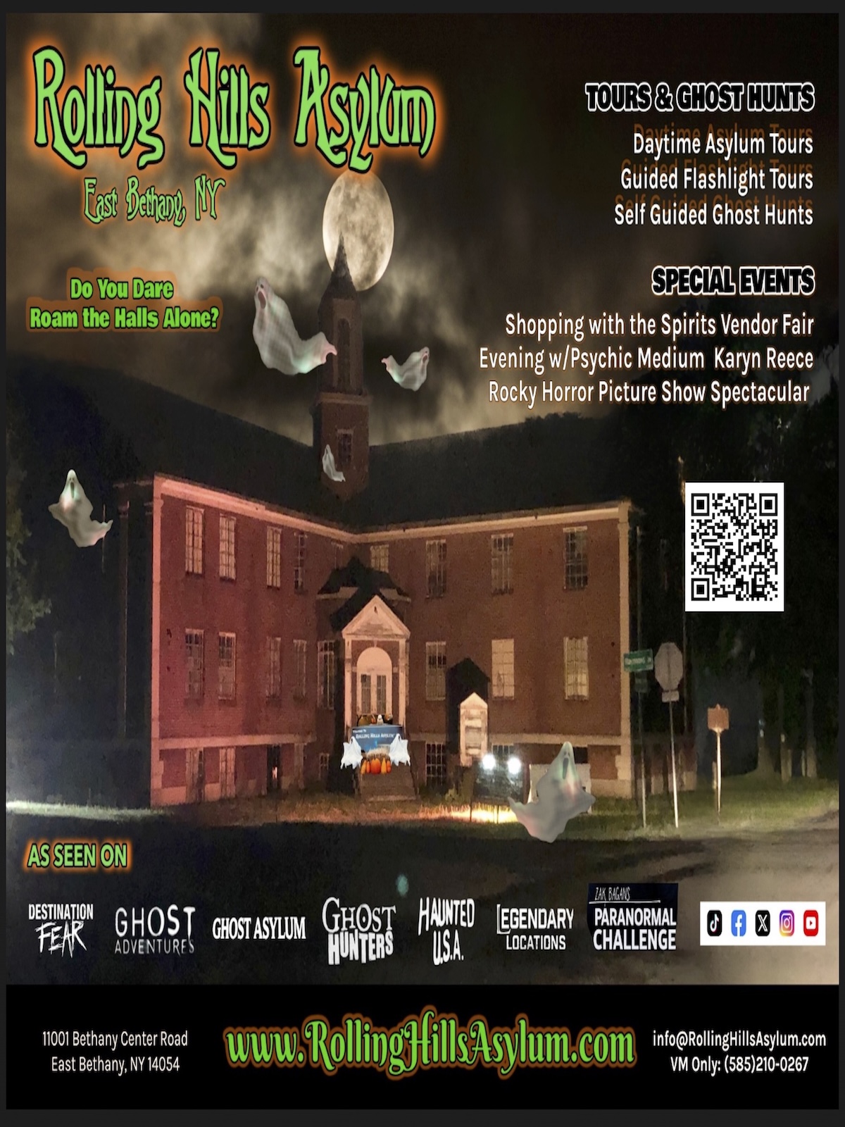 October 12, 2025- NY State Path Through History Self Guided Daytime Asylum Tour- 2p-4p- $29 Step inside Rolling Hills Asylum, where nearly two centuries of history and hauntings converge. Once a poorhouse, infirmary, orphanage, and nursing home, it has witnessed more than 1,700 deaths—and countless reports of shadow figures, phantom voices, and unseen footsteps. By daylight, wander the asylum’s most storied spaces at your own pace, where history speaks and, at times, whispers, and the past still stirs just beyond the veil. Discover the stories of those who lived and worked here through historical plaques and photos displayed throughout, with a touch of the paranormal that has made Rolling Hills famous. Experienced Staff on Hand to answer questions and elaborate on historical information. Step into history… and feel the past come alive. Ticket Info: 18+ with valid ID. Ages 14–17 with parent (pre-authorization 2 days ahead). Parking: 30 min before | Check-in: 15 min | No late entry. Bag rules & restrictions apply. No outside food/drinks. Closed-toe, closed-heel shoes required.