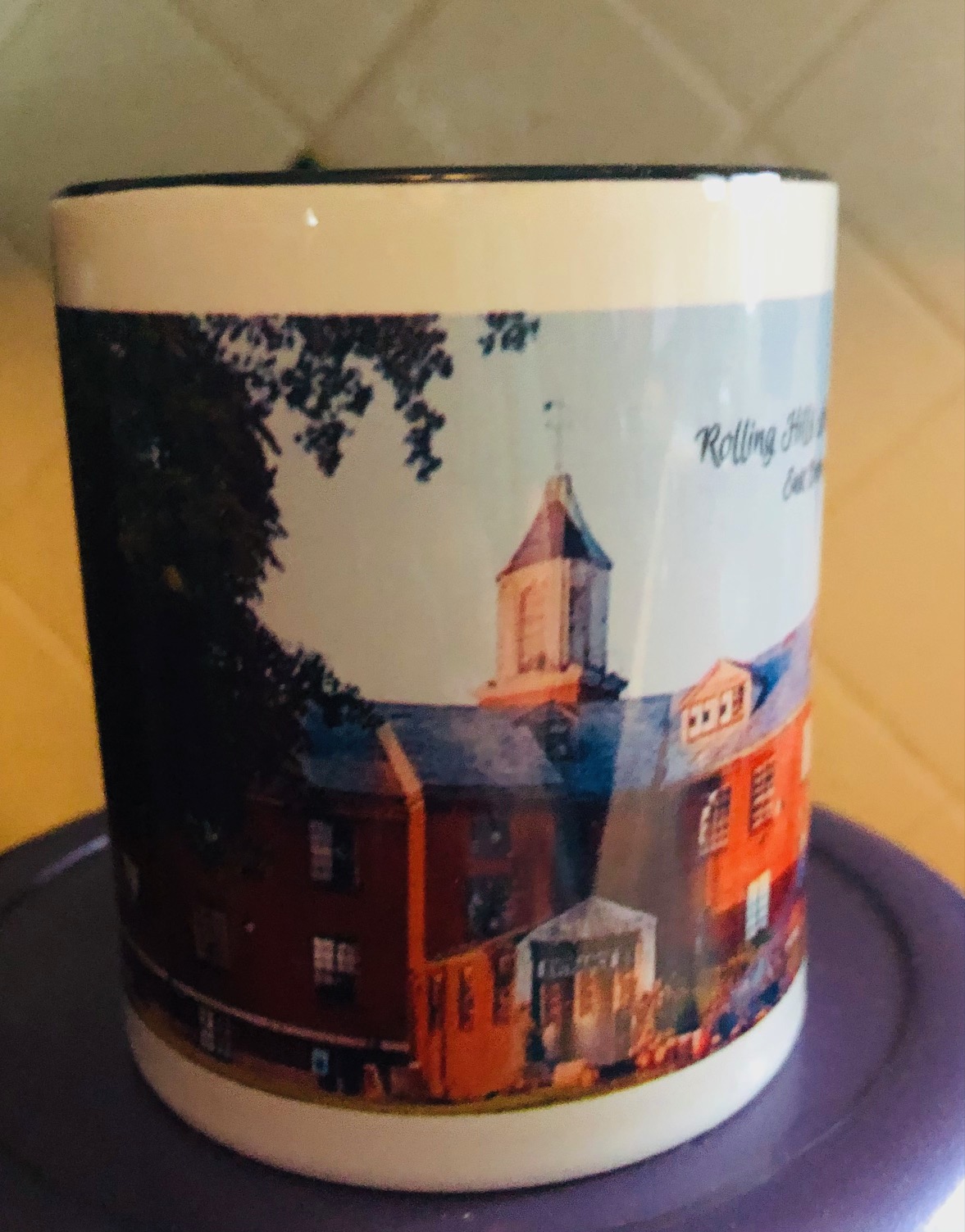 The image is the back of the infirmary - the Entrance Ramp view including the Historical Marker with info clearly legible.  Image wraps around the mug.